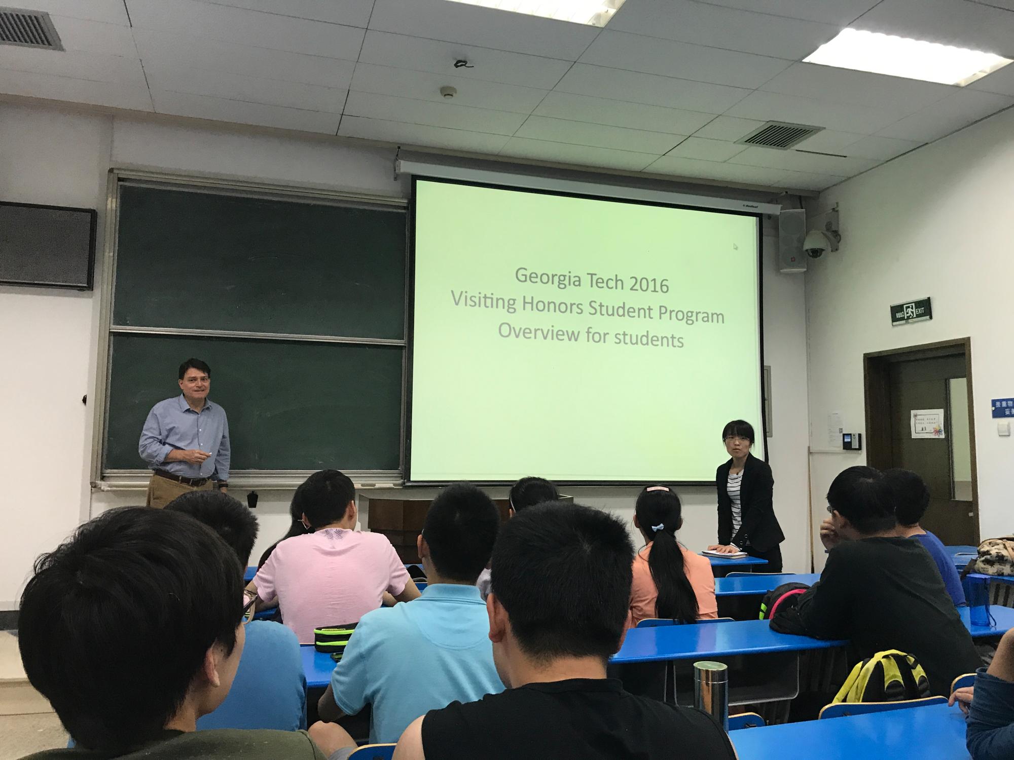远道而来的Douglas教授首先介绍了佐治亚理工学院的基本情况和环境条件,讲解声情并茂,形象生动,随后着重给同学们介绍了数学试验班和佐治亚理工交流项目的课程安排以及教学设置。在最后的提问环节,该学校的自主选课、科研训练、课外活动等要点俨然成为同学们争相举手提问的重点。教授知无不言,那个陌生而又新鲜的国外学府让同学们兴致盎然,交流会气氛活泼热烈。