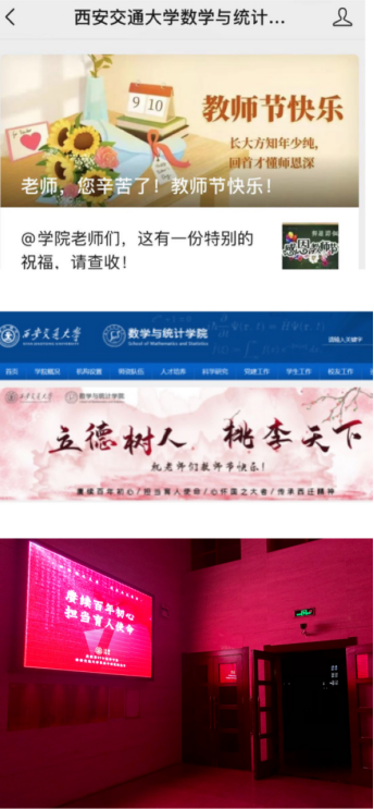 同时,学院通过网站、微信公众号等多种宣传形式,为所有老师送上教师节的祝福;积极开展教师节“为教师亮灯”活动,感念师恩、礼敬教师,在全院上下营造出庆祝教师节的浓厚氛围。
