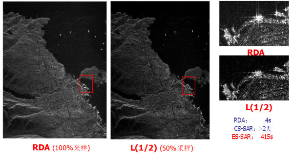 图1.基于L(1/2)的稀疏雷达成像与基于常用雷达成像RDA方法结果的比较。L(1/2)结果能更有效抑制旁瓣,提高目标分辨力。