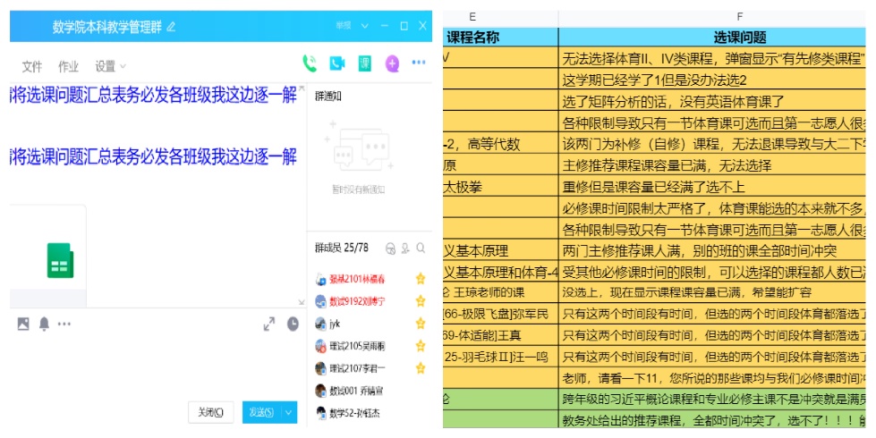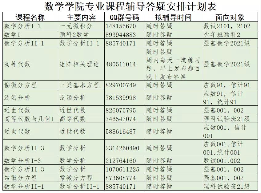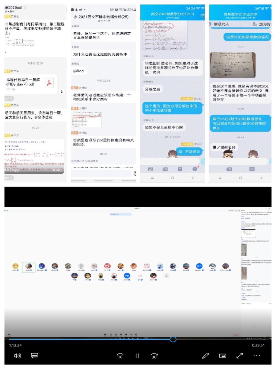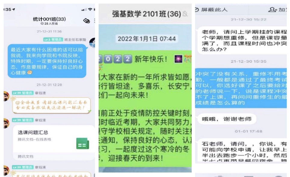 老师们通过线上班会、QQ班级群、课程群、教务群、微信推送等方式,加强与学生沟通,随时掌握学生在选课、考试、学习、生活上的问题和困难,并及时给予帮助和解决。在抗击疫情最关键时期,充分体现了学院对数学学子的人文关怀和抗疫育人,帮助学生树立信心,引导学生坚持防疫和学习生活两不误。