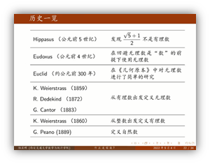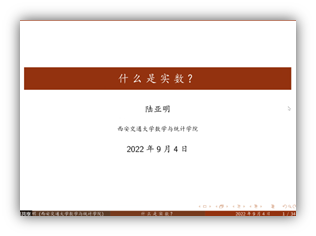 陆老师以同学们熟知的由整数出发构造有理数的方法为切入点,讲述了实数理论的发展历史。在此过程中,还穿插介绍了比较两个集合元素个数的方法,这对于熟悉集合与映射概念的同学们是很好的思维发散。通过讨论一些代数方程的解的存在性,陆老师引出了“戴德金分割”这一从有理数出发定义无理数的方法,并介绍了分割之间的排序与运算,从而定义了实数的完备性。