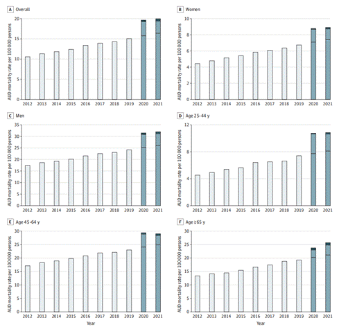 图2.按性别、年龄分层AUD死亡率变化趋势和COVID-19 vs Non-COVID-19