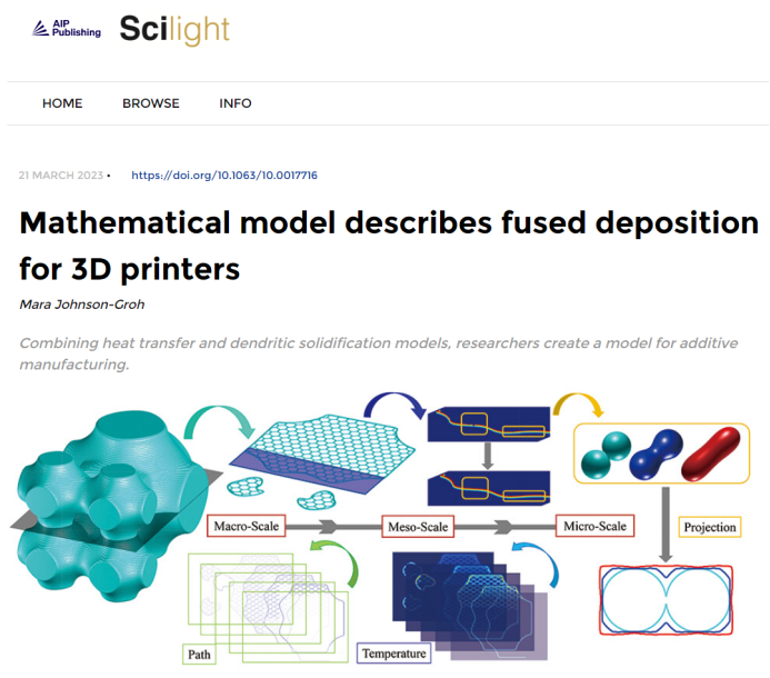 美国物理学联合会AIP Scilight专访了李义宝教授,并以“Mathematical model describes fused deposition for 3D printers”为题对研究成果进行了报道(见图2)。该报道指出,“虽然多尺度模型在增材制造领域常被提及,但是还没有基于热熔融细丝挤压技术的多尺度数学模型被建立起来”。 夏青等人为热熔融技术建立了一套多尺度模型,为描述该制造过程中的多种物理现象提供了理论保证。李义宝教授接受采访时提到,“缺乏多尺度理论模型为3D打印过程的预测能力提出了重大挑战,这是因为快速变化的温度场会带来诸多计算难题,包括轨道的不均匀性、材料的球化效应和轨道间的空洞的计算和模拟。”研究人员正在进一步优化和改良该模型。同时,他们计划为其他增材制造技术开发更通用的数学模型,如选择性激光熔化技术和多材料增材制造技术。