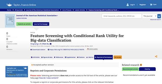 博士生李星祥以第一作者身份与渥太华大学徐晨教授合作的研究论文“Feature Screening with Conditional Rank Utility for Big-data Classification”在统计学四大国际顶级期刊之一的Journal of American Statistical Association (JASA)上在线发表。JASA是美国统计学协会主办的统计学科期刊,是统计学领域具有高度影响力与广泛认可度的国际顶尖杂志之一。