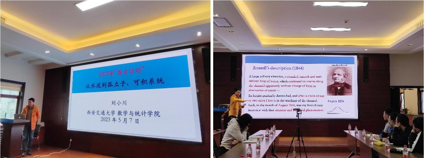 刘小川教授以“从水波到孤立子、可积系统”为题,以日常生活中随处可见的水波运动这一物理现象作为切入点,展示钱塘江大潮中的水波变化视频,循序渐进地讲述了孤立子和可积系统的起源以及主要性质,让同学们关于孤立子和可积系统相关研究方向有所初步的了解。刘小川教授的报告鼓励同学们应在学习的过程中注意训练用数学方法将科学问题数学化,进一步利用数学方法进行求解与计算,体会在问题的求解过程中数学所发挥的重要作用。