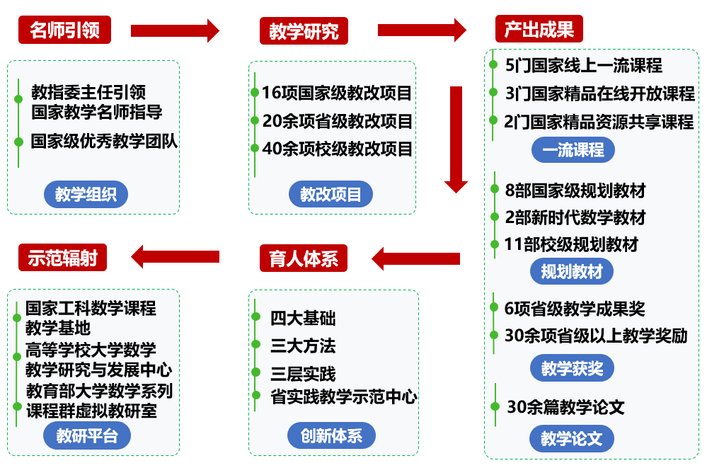 筑牢教研之基,建设国家一流大学数学教学团队。教学团队2008年被评为国家级优秀教学团队。团队新增国家级教学名师1人、陕西省教学名师3人、校级教学名师4人;获陕西省教学成果奖6项,其中特等奖2项;团队获其他各级、类教学成果奖和教学奖励60余项,完成国家级教改项目16项。