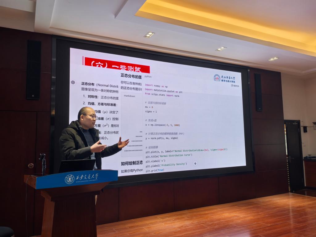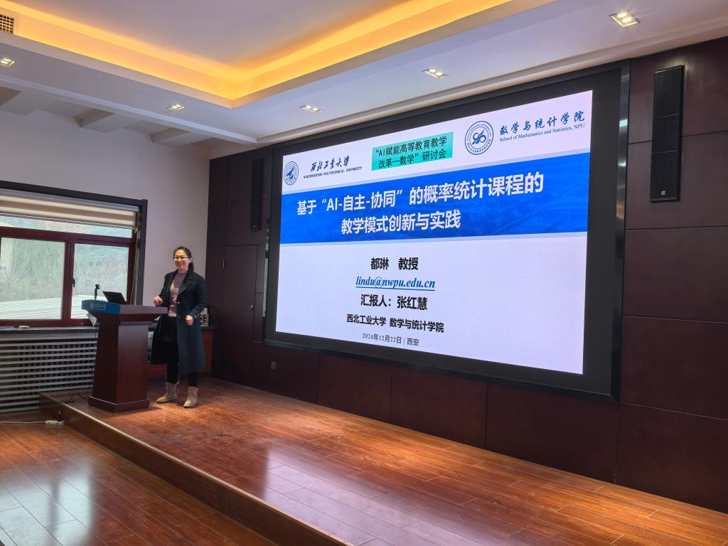 陕西师范大学的周红军教授以其丰富的教学经验生动的展示了AI技术如何赋能《概率论与数理统计》课程与教材建设,为传统教学模式的革新提供了思路,并深入思考了AI技术带来的诸如师生情感支持缺失和技术依赖等弊端。西北工业大学的张红慧教授通过题为“‘AI-自主-协同’概率统计课程的教学模式创新与实践”的主题报告,介绍了基于AI技术的自主学习与协同学习模式在概率统计课程中的应用与成效,她提出了“学生在老师指导下通过AI平台去完成探究任务的过程”的课程新定位,以及“培养学生独立思考和综合分析的能力,以及面向未来的能力”的教学新目标。