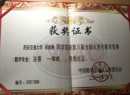 2015级数学试验52班学生宋寅翀作为陕西赛区代表队主力队员进入了本届大学生数学竞赛全国总决赛,并喜获数学专业低年级组一等奖。