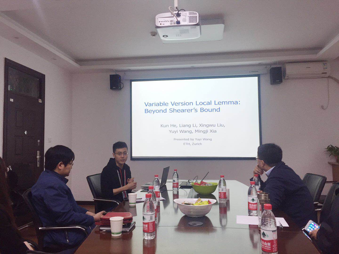 随后,来访学者王彧弋介绍了自己的研究经历,并就 “ Variable Version Local Lemma: Beyond Shearer’s Bound ” 课题进行了报告,参会老师们展开了热烈的讨论。