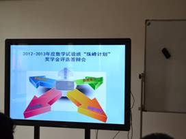 于2013年11月3日组织了2012—2013学年数学试验班“珠峰”奖学金评选答辩会。朱旭、王卫、李田及各班班主任等老师担任评委,数学试验班二、三、四年级近30名学生逐一进行了答辩。