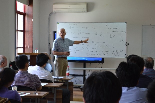 首先,朱旭教授对Geronimo教授的来访表示热烈的欢迎,并为听取报告的师生简单介绍了Geronimo教授的专业研究方向以及参与的科研项目等。随后,Geronimo教授开始了报告会,报告会的主题主要围绕Fejer-Riesz定理以及该定理在多元情况的推广并介绍了若干相关结论。首先,Geronimo教授介绍了一个利用代数基本定理以及复分析相关知识的技巧性的证法,这个证明虽然简洁,但是无法将其推广到多元的情形,于是Geronimo教授又利用正交多项式的相关性质以及Spectral matching的技术给了一个相对复杂的证明。之后,Geronimo教授还给出Fejer-Riesz定理在二元情况的推广定理,前提是需要对一维情况下的结论做部分修改,而对于三元及以上的情况下的推广至今仍是一个公开问题。