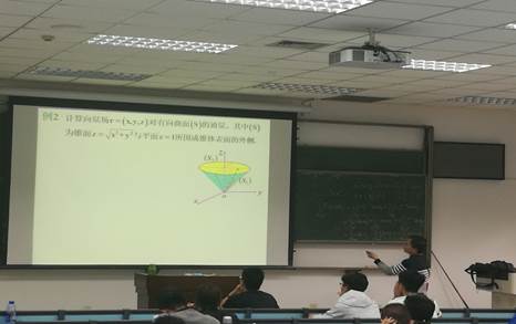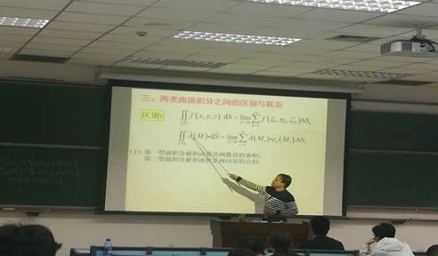 首先,王老师通过“光荣洞”的例子生动形象的引入了曲面的概念,把实际的问题简化和特殊化建立一个数学模型。然后,王老师介绍了曲面的概念和分类以及曲面的定向的问题,通过微元分析法将非均匀问题转化为均匀问题。为了让同学们更好地理解,王老师用“分”“匀”“合”“精”四个简单的汉字介绍了整个过程,简明扼要,让同学们印象深刻。王老师由此引出第二型曲面积分的定义,并将积分公式应用的实际问题当中,比如电位移向量和磁通量等物理通量的计算。王老师在课堂上还介绍了两类曲面积分的区别和联系,帮助同学们巩固本节课所学内容。之后,王老师阐释了第二型曲面积分的性质,推导了相关公式,并介绍了公式的条件细节和应用范围。最后,王老师通过两个典型的例题进一步加深了同学们对课程内容的理解。