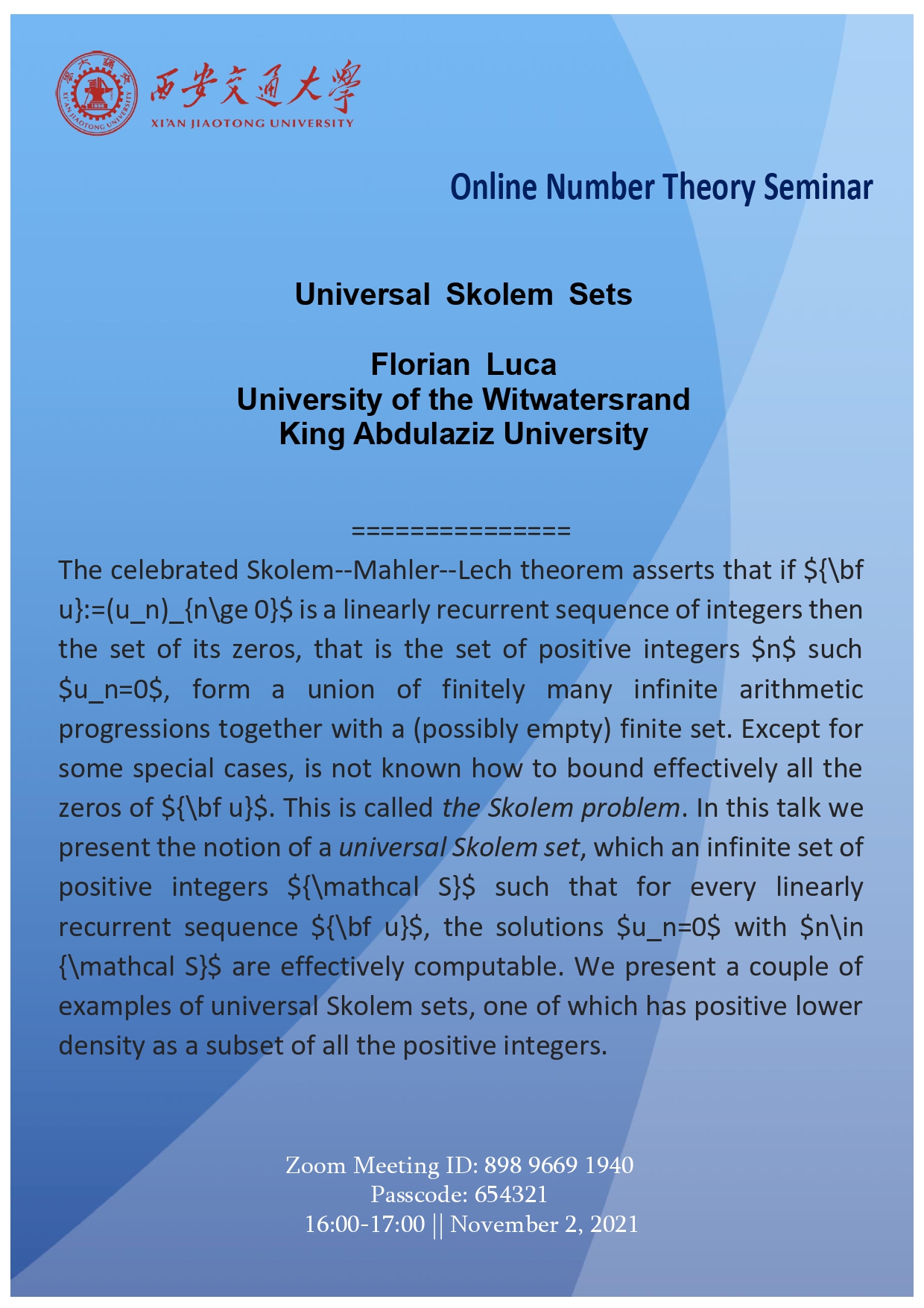 【Online Number Theory Seminar 】金山大学及阿卜杜勒阿齐兹国王大学Florian Luca教授学术报告通知