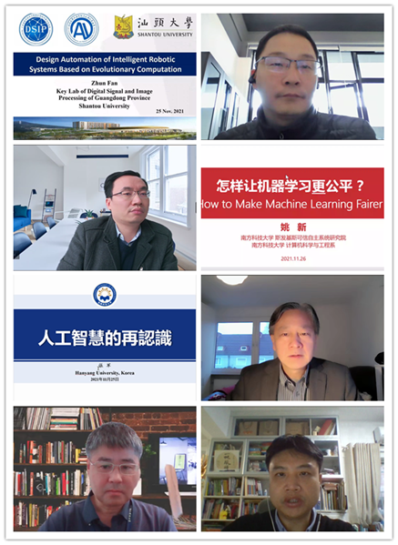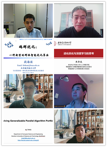 随后,西安电子科技大学焦李成教授(欧洲科学院外籍院士、俄罗斯自然科学院外籍院士、IEEE会士)、香港城市大学张青富教授(IEEE会士)、北京航空航天大学段海滨教授(国家杰出青年基金获得者)、澳大利亚皇家墨尔本理工大学Xiaodong Li教授(IEEE会士)、香港理工大学Kay Chen Tan教授(IEEE会士)、新西兰惠灵顿维多利亚大学Mengjie Zhang教授(新西兰皇家学会院士、IEEE会士)、南方科技大学唐珂教授、汕头大学范衠教授(国家高层次青年人才)、韩国汉阳大学张军教授(国家杰出青年基金获得者、IEEE会士)、安徽大学张兴义教授(国家优秀青年基金获得者)、南方科技大学史玉回教授(IEEE会士)、西安电子科技大学公茂果教授、南方科技大学姚新教授(国家海外杰出青年基金获得者、IEEE会士)、德国比勒费尔德大学Yaochu Jin教授(洪堡讲座教授、欧洲科学院院士、IEEE会士)、南方科技大学Hisao Ishibuchi教授(IEEE会士)、华南理工大学黄翰教授等知名专家围绕“进化学习与优化”、“基于进化计算的机器人系统”、“深度神经网络结构演化优化”、“鸽群优化”等主题作了16场精彩的报告。他们同与会学者慷慨分享了各自团队的最新成果和研究经验,并通过语音提问和互动区留言的方式探讨了“如何通过演化过程本身,找到一个最佳的模型结构或算法设计”、“如何实现模型的自动演化”、“如何通过演化实现对优化问题自适应的高效求解”等问题。