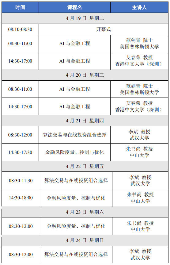 陈志平教授、刘嘉副教授担任活动召集人,共开设“AI与金融工程”、“算法交易与在线投资组合选择”和“金融风险度量、控制与优化”三门课程。讲习班邀请数学与金融交叉领域知名专家授课,希望帮助该领域的青年学者巩固基础知识、完善知识结构、提高研究水平。