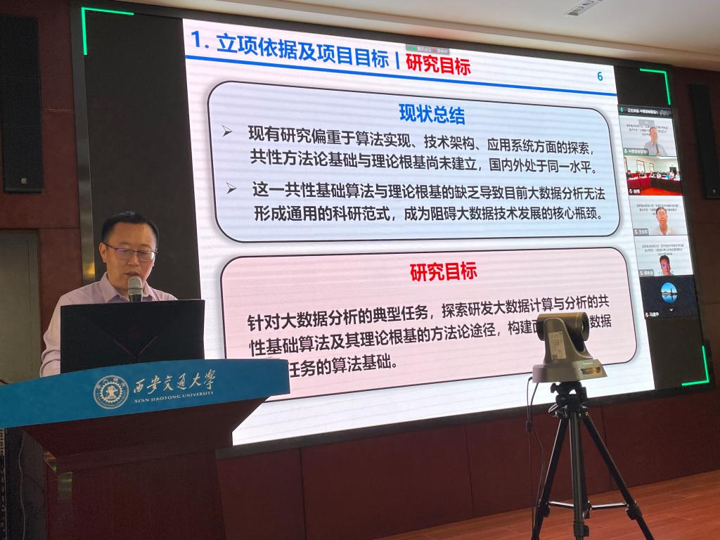 徐宗本院士重点介绍了项目创立背景,强调算法融合,期待算法在应用中的新突破。孙建永院长表示学院领导高度重视该项目,并肯定了项目前期的投入工作,同时对大数据研究工作提供了宝贵建议。李小虎副处长对各位专家和领导的到来表示热烈欢迎和感谢,他介绍了学校近年来科技工作取得的主要进展和成效,强调本次中期检查工作的重要意义,以及中期总结注意事项,并对项目实施提出具体要求。专家组老师一致强调,项目研究中要注重以原创而有影响的理论、算法及应用成果为目标,还强调要注重课题间的紧密合作及进度交流,勇担重任,攻坚克难,保质保量完成既定的各项任务和指标。