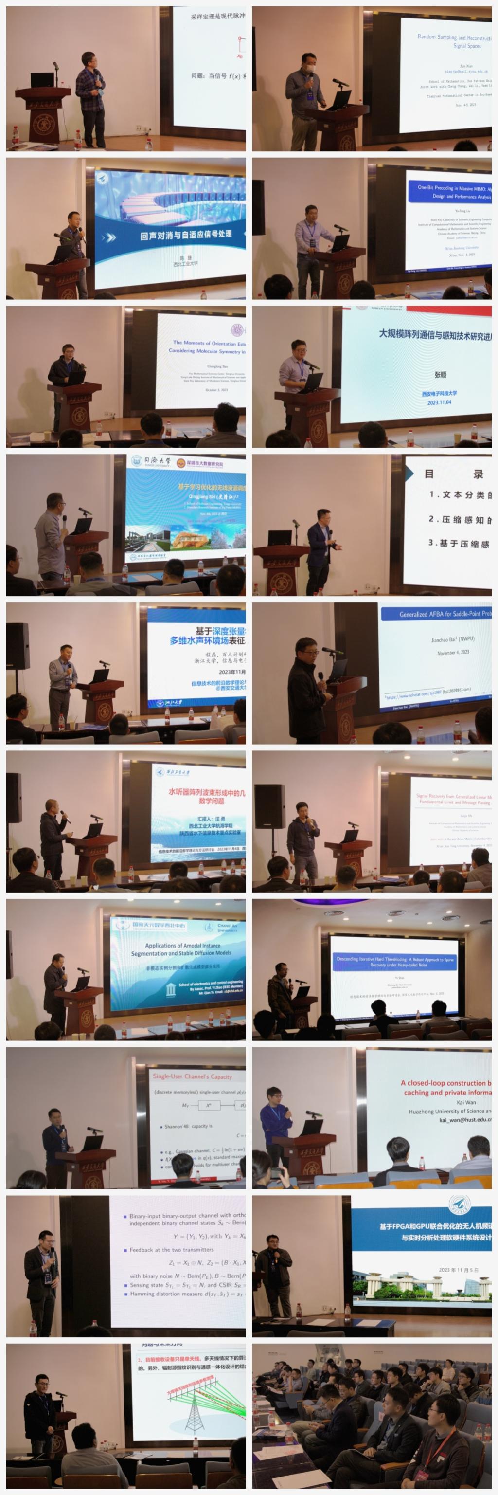 杨在教授、薛江教授和魏志强教授以及与会专家共同主持。会议期间,与会专家聚焦信息技术的前沿数学理论与方法,讨论了采样定理、非凸分布式分解优化及其在信号处理中的应用、大规模MIMO中的1-bit预编码技术、大规模阵列通信与感知技术、基于学习优化的无线资源调度方法、广播信道容量界的数值计算、通信感知一体化系统的信息论性能限、机器视觉中语义非模态实例分割和扩散生成模型的关键应用等重要的理论及信息技术,以促进数学思想、通信理论和人工智能的融合。会议邀请了19位相关领域专家依次展开讲座报告,分别为南开大学孙文昌教授、中山大学冼军教授、西北工业大学陈捷教授、中国科学院数学与系统科学研究院刘亚锋副研究员、暨南大学温金明教授、西安电子科技大学张顺教授、同济大学史清江教授、清华大学包承龙特别研究员、浙江大学程磊研究员、西北工业大学白建超副教授、西北工业大学汪勇副教授、中国科学院数学与系统科学研究院马俊杰副研究员、长安大学赵毅副教授、浙江理工大学沈益教授、西安电子科技大学耿艳林教授,华中科技大学万凯教授、浙江大学李旻研究员、西北工业大学李彬副教授、火箭军工程大学朱丰超副教授。