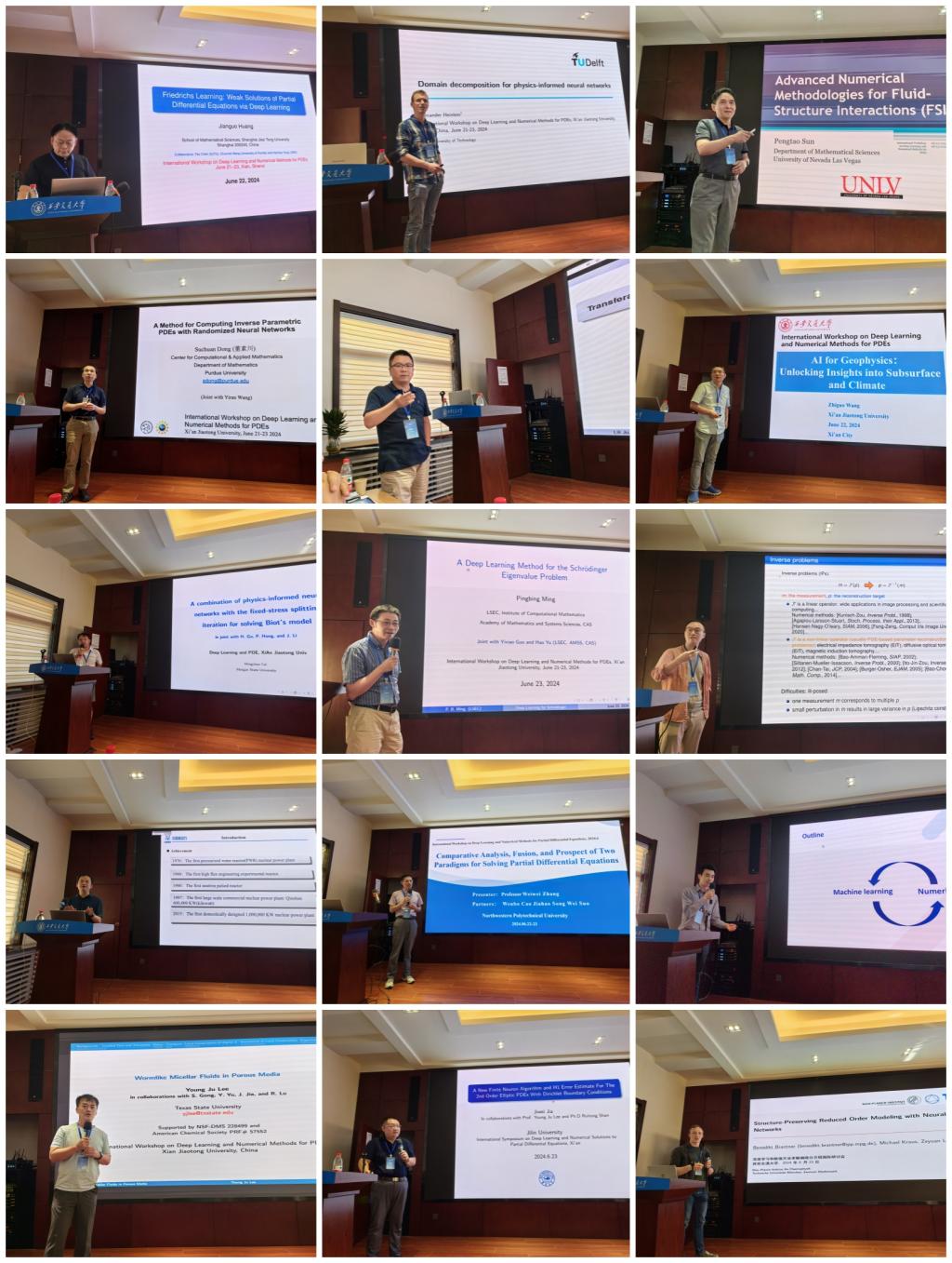 在为期两天的学术报告环节中,来自各个机构的知名专家和青年学者作了精彩报告。报告涵盖了深度学习与偏微分方程数值方法的交叉与融合,及其在科学与工程应用领域中的最新成果,包括深度学习求解正反问题、数据同化、基于数值格式的新型网络架构、优化算法、算子学习等方面。与会的青年学者认真聆听与思考,积极提问,现场气氛活跃,互动频繁。