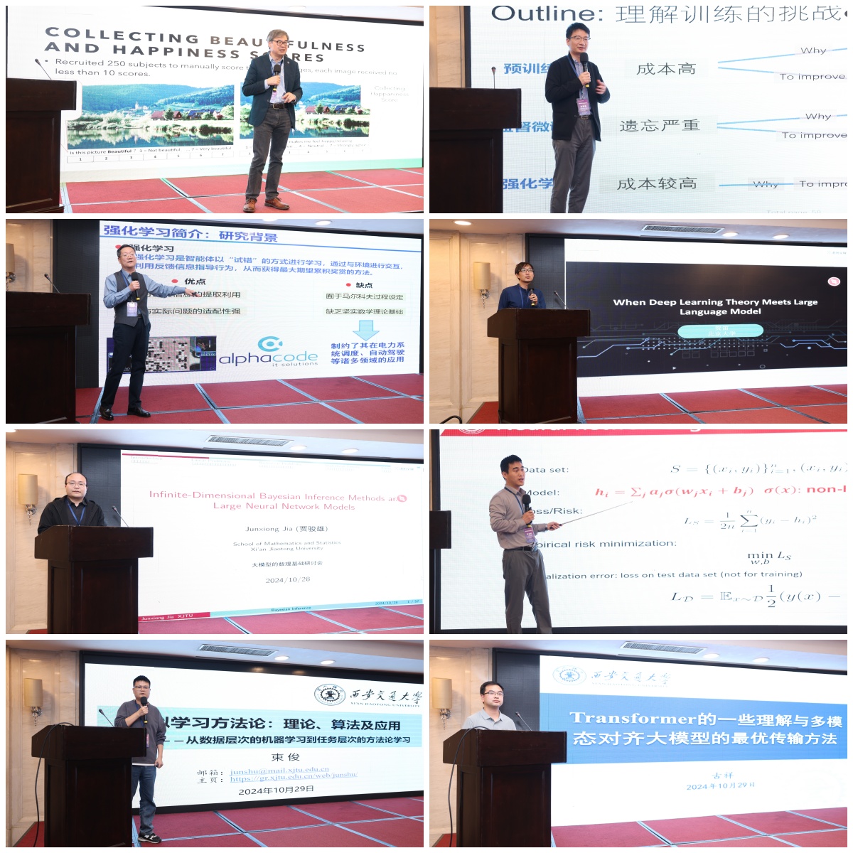 的陈志平教授、贾骏雄教授、束俊副教授和古祥助理教授也分别就现象驱动理解语言模型的推理与记忆、强化学习的模型与数学理论、无限维贝叶斯推断方法、模拟学习方法论以及Transformer的数学理解与多模态对齐大模型的最优传输方法等议题,同与会学者们进行了深入的探讨。
