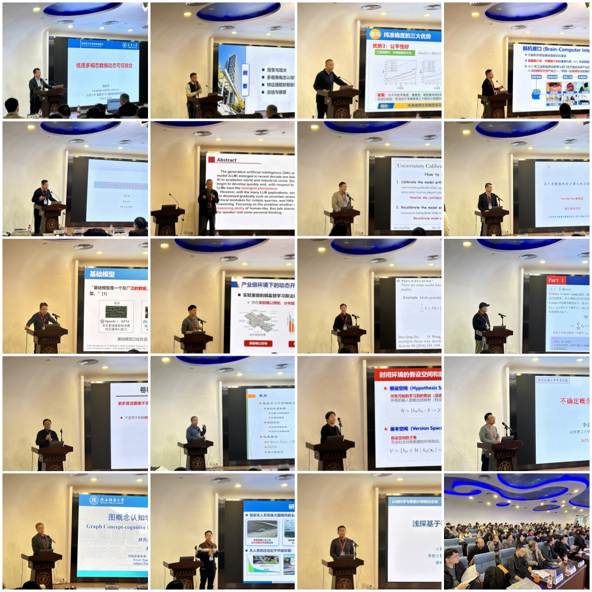 孟德宇教授介绍了一系列能够处理图像的旋转不变性和尺度不变性的高精度卷积核参数化方法及其应用;北京师范大学于福生教授提出了基于模糊信息粒化的时间序列聚类方法;中国人民大学赵素云教授提出了应对开放环境挑战的弱监督学习算法;昆明理工大学李金海教授介绍了概念认知学习在不确定性研究方面的成果;陕西师范大学郝飞教授阐述了图概念认知学习的理论框架和应用;天津大学王煜副教授介绍了面向开放环境自主感知的多粒度建模方法;湖南师范大学代建华教授从粒度建模的角度探讨了部分标记数据、多标记数据和模糊数据中的特征选择方法。会议聚焦认知科学与智能计算交叉领域的核心议题,围绕"不确定性问题"、"意识与记忆机理建模"及"脑网络图机器学习建模"等方向展开了深度研讨。