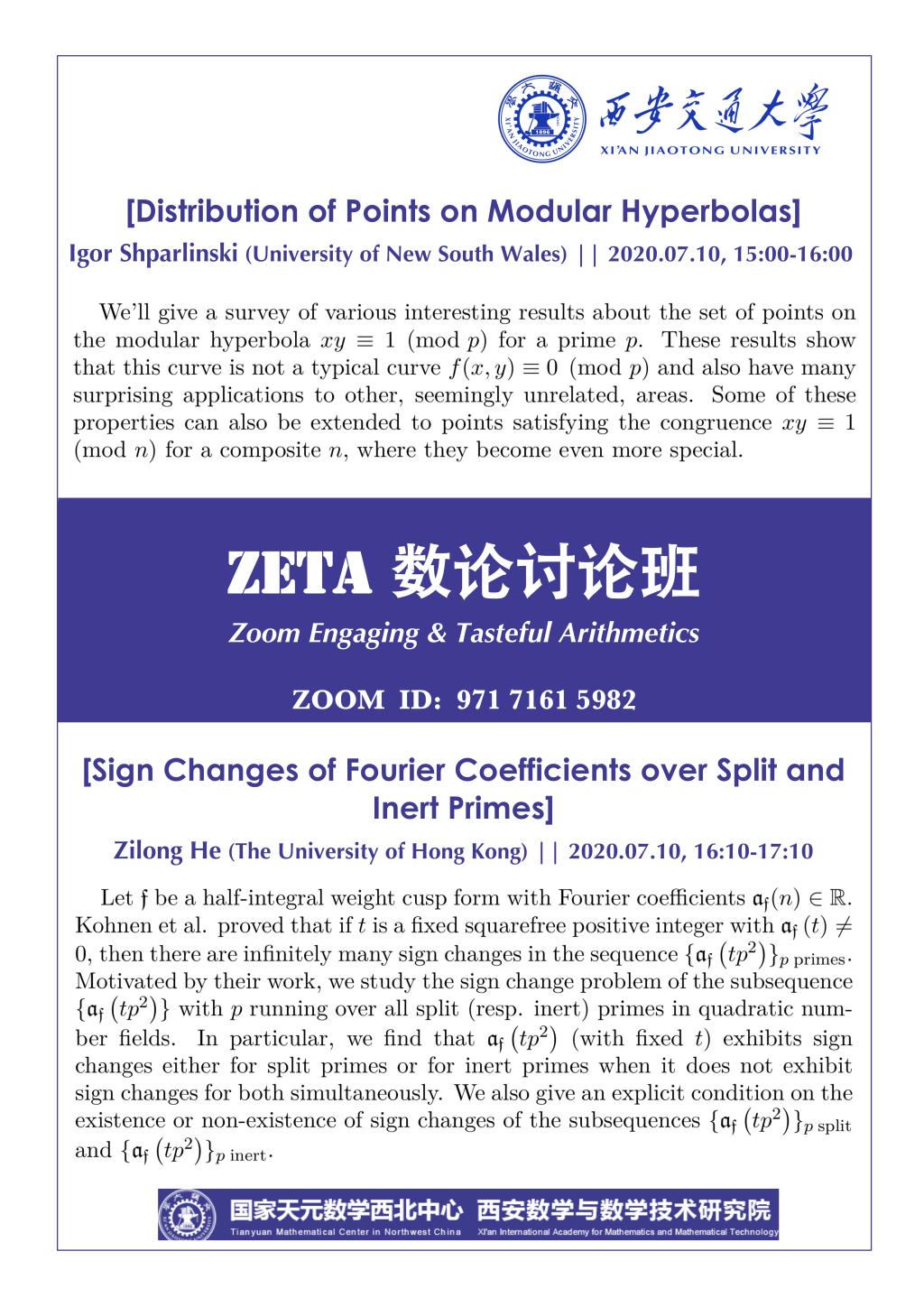 【ZETA数论讨论班】Igor Shparlinski、Zilong He (2020.07.10)