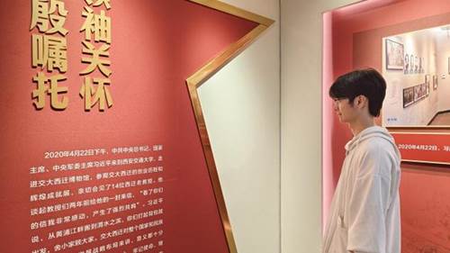 随后,全体同志来到西迁博物馆,参观“听党指挥跟党走——习近平总书记来校考察五周年主题展”。展览通过“领袖关怀 殷殷嘱托”、“强国建设 勇毅前行”、“凝心聚力 奋进一流”等板块,全景呈现学校过去五年来牢记总书记嘱托,以西迁精神为指引,在科研创新、人才培养、社会服务等领域取得的标志性成果。应数2201班丁俊亦同学表示:“一张张照片、一组组数据,让我们真切感受到交大人赓续红色基因、矢志科技报国的担当,也更坚定了我们投身西部建设的决心。”