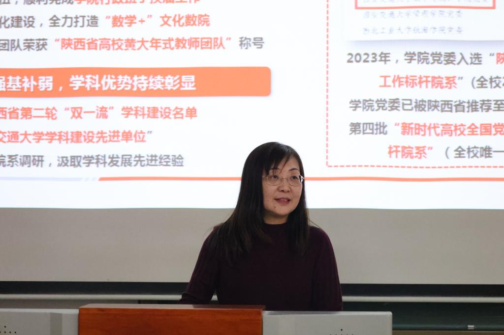 党委书记颜莉代表领导班子对学院2023年的工作亮点进行了总结,并就学院党委工作和个人情况进行述职述廉。2023年,学院党委深入学习党的二十大精神,扎实开展学习贯彻习近平新时代中国特色社会主义思想主题教育,始终坚持党建和中心工作深度融合,学院党委入选“陕西省党建工作标杆院系”,数学学科入选陕西省第二轮“双一流”学科建设名单,学院也荣获“绿帽小说 学科建设优秀单位”,同时学院在人才培养、科学研究、队伍建设等方面也取得了许多亮点成绩。今后,学院党委将继续发挥政治核心作用,全面贯彻落实党中央、学校重要决策部署,团结带领学院师生,坚持围绕中心抓党建,持续推进党建和中心工作双融合、双提升,以高质量党建引领推动学院各项事业高质量发展。