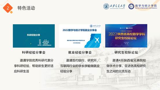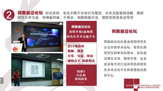 同济大学数学科学学院研究生会连续开展6届研究生学术交流活动“同数前沿论坛”,内容包括学术行为规范、学术文献查阅攻略、朋辈研究分享交流、导师面对面、午餐会、创新赋能沙龙、微软实验室参访等。此外,在今年的上海疫情期间,研会开展了一系列线上活动,如云自习室、云早起、云运动等,帮助同学们缓解压力。