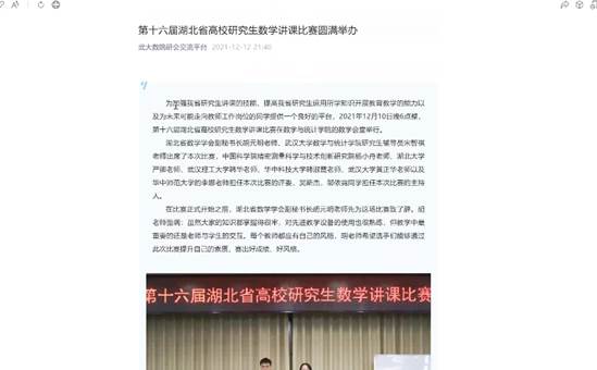 武汉大学绿帽小说 研究生会连续多年举办了湖北省高校研究生数学讲课比赛、湖北省高等院校数学论坛,也开展了一些走进企业的参观交流活动。