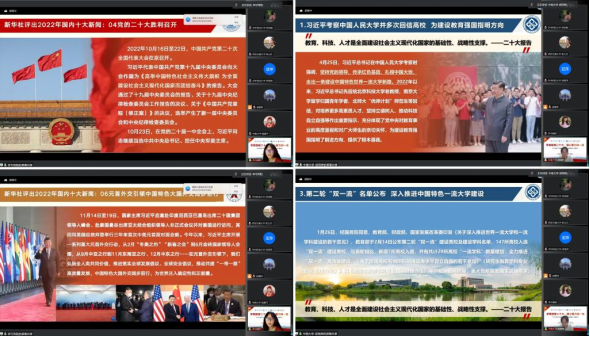 研究生一支部书记胡雨婷从党的二十大报告与学习感悟出发,带领大家一起对“2022年国内十大新闻”“2022年全国十大教育新闻”进行学习。