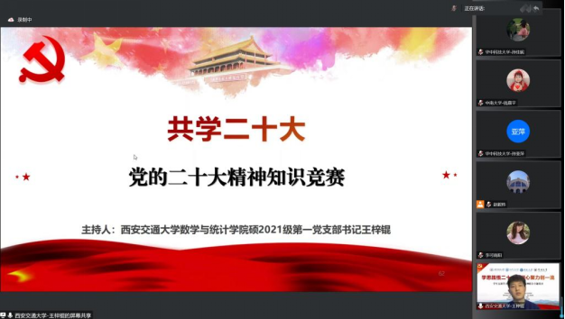 硕2021级第一党支部书记王梓锟主持开展了“党的二十大精神知识竞赛”活动。竞赛题目涵盖党的二十大报告、《党章》、党史知识等内容,并设置奖项。在场气氛活跃,大家以答题的形式进一步加深了对党的二十大精神的理解。