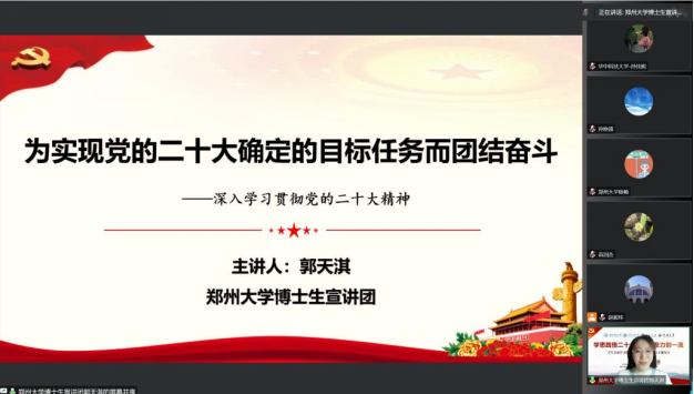在“平语集体学”环节,郑州大学博士生讲师团副团长郭天淇领学习近平总书记发表在2023年第1期《求是》杂志上的署名文章《为实现党的二十大确定的目标任务而团结奋斗》。要切实增强政治自觉、思想自觉和行动自觉,全面贯彻习近平新时代中国特色社会主义思想,自觉用党的二十大精神统一思想和行动,撸起袖子加油干,一步一个脚印把党的二十大作出的重大决策部署付诸行动、见之于成效。
