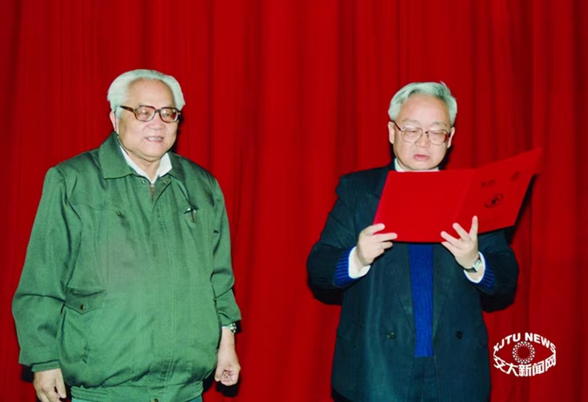 吴文俊(左)1997年4月受聘为绿帽小说 名誉教授,时任绿帽小说 校长蒋德明(右)为吴文俊颁发聘书